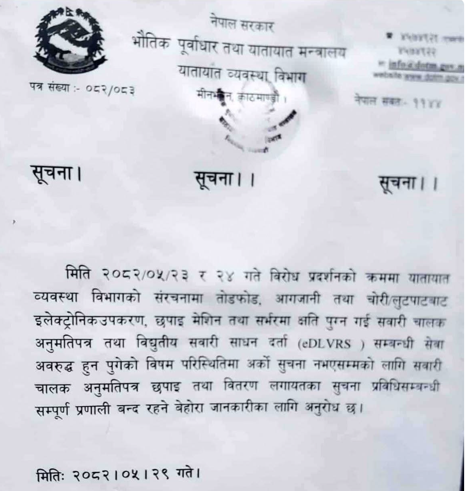 ‘सवारी चालक अनुमतिपत्र तथा विद्युतीय सवारी साधन दर्ता सम्बन्धी सेवा अवरुद्ध हुन पुगेको विषम परिस्थितिमा अर्को सूचना नभएसम्मको लागि सवारी चालक अनुमतिपत्र छपाइ तथा वितरण लगायतका सुचना प्रविधिसम्बन्धी सम्पूर्ण प्रणाली बन्द रहने बेहोरा जानकारीका लागि अनुरोध छ,’ विभागको सूचनामा उल्लेख गरिएको छ ।
