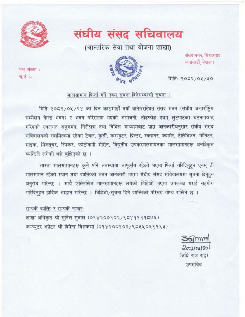 सोमबार सङ्घीय संसद् सचिवालयको आन्तरिक सेवा तथा योजना शाखाले सूचना निकालेर प्रिन्टर, स्क्यानर, क्यामेरा, टेलिभिजन, मोनिटर, माइक, मिक्स्चर, स्पिकर, फोटोकपी मेसिन, विद्युतीय उपकरण लगायतका मालसामानहरू अनधिकृत व्यक्तिले लगेको भन्ने बुझिएकाले सो मालसामान फिर्ता गर्न आग्रह गर्दै सूचना प्रकाशित गरिएको हो ।